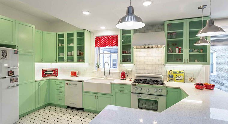 Sometimes, little things add the necessary touch for a retro look. Granite or quartz countertops in a neutral color can serve as the canvas for a colorful mosaic backsplash and flat-slab cabinets. Finish off the subtle hints with vintage d?cor, such as matching canisters in mint green under warm LED under cabinet lighting.