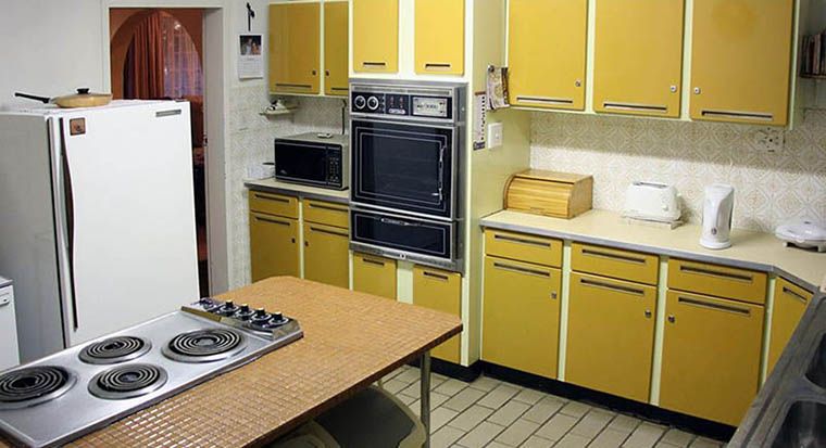 Bold colors are actually characteristic of the mid century modern style, so yellow or orange countertops with matching backsplashes is a perfect way to make a midcentury splash in your kitchen. Add a black-and-white checked floor and you have a striking kitchen. To balance out the strong colors, choose neutral cabinets and appliances.